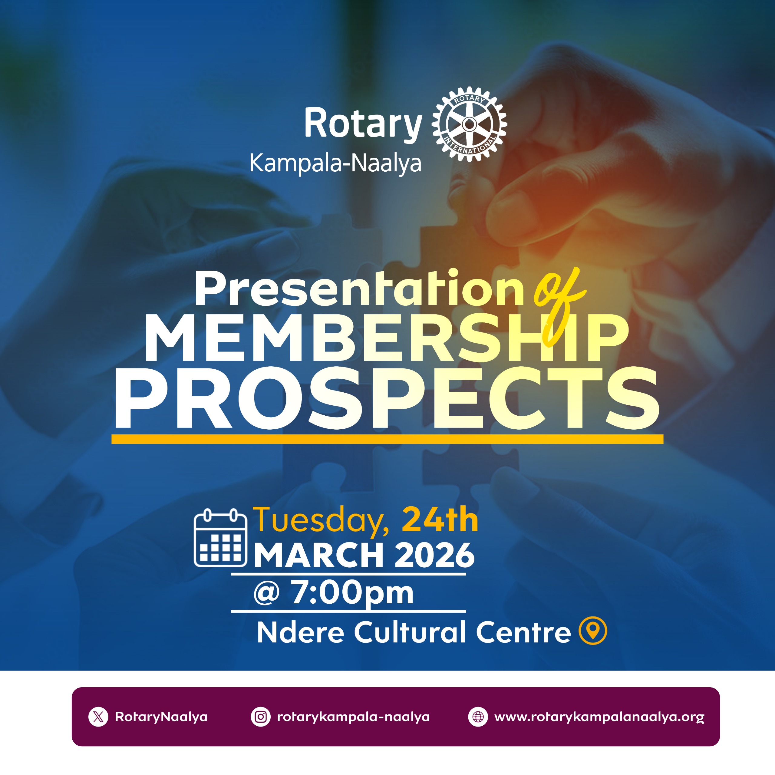 The Rotary Club of Kampala Naalya was chartered on March 14, 2012. Through Rotary International, the Club undertakes community service projects on the seven (7) areas of focus of Rotary, namely: Peace and Conflict Resolution/Prevention, Disease Prevention and Treatment, Water and Sanitation, Maternal Child health, Basic Education and Literacy, Economic and Community Development, Environment